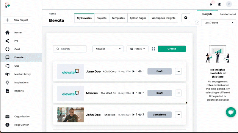 Creating a new Elevate is straightforward and designed for user convenience. Users can simply log into the Shootsta Platform and navigate to the Elevate section. Here, you will be able to choose the option to create a new video using the new streamlined workflow.